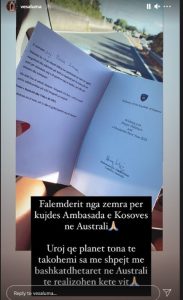 “Falemnderit nga zemra për kujdes Ambasada e Kosovës, në Australi. Uroj që të takohemi sa më shpejt me bashatdhetarët në Australi këtë vit”, ka shkruar midis tjerash Luma.